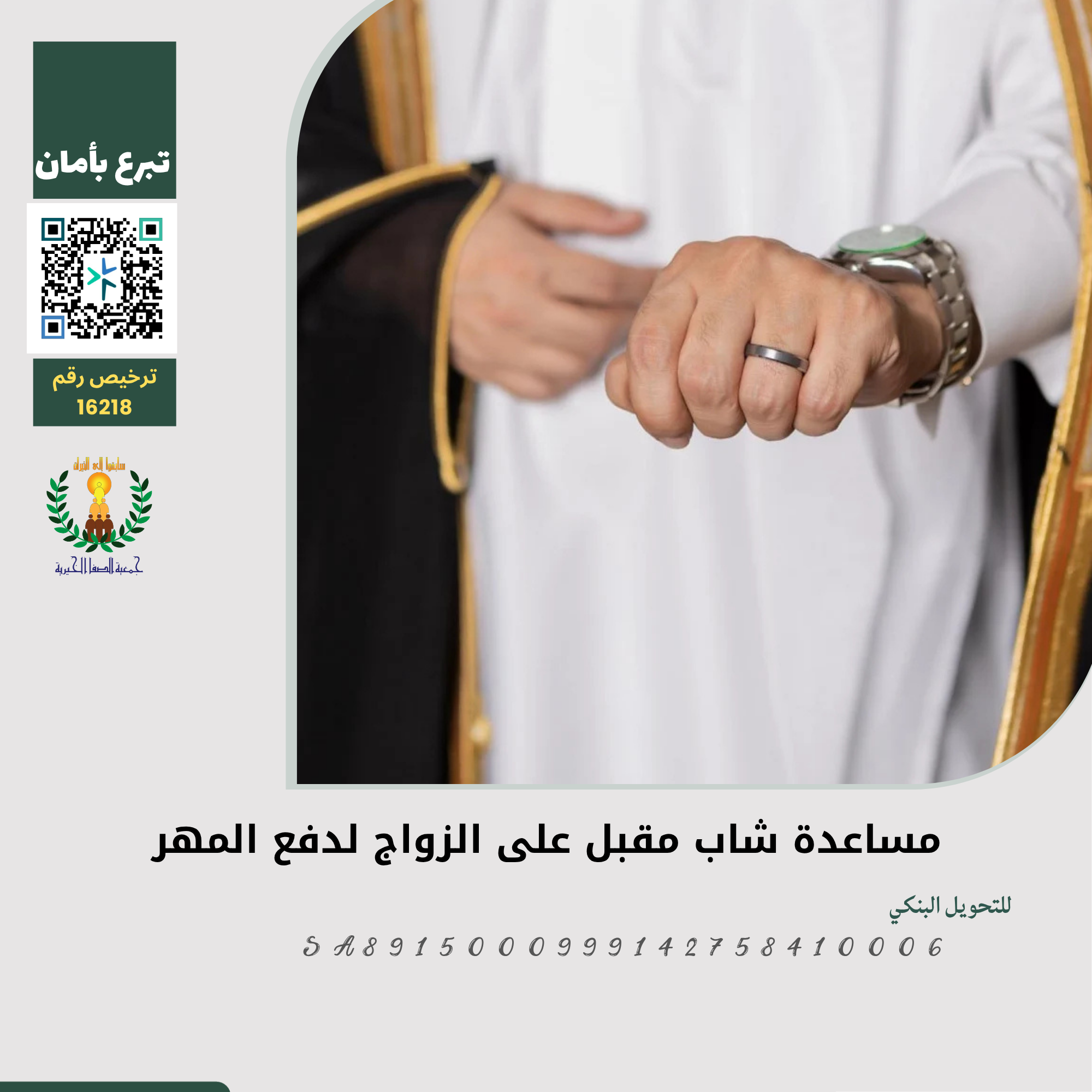 شاب من ذوي الدخل المحدود، يرغب في الزواج وتكوين عائلة تعينه وتبعث في نفوسهم الاستقرار والطمأنينة، وبسبب دخله المتدني ليس لديه القدرة على تحمل تكاليف الزواج، تبرع بما تجود به نفسك، وكن سبباً في سعادته ، قال الله تعالى: "لن تنالوا البر حتى تنفقوا مما تحبون"